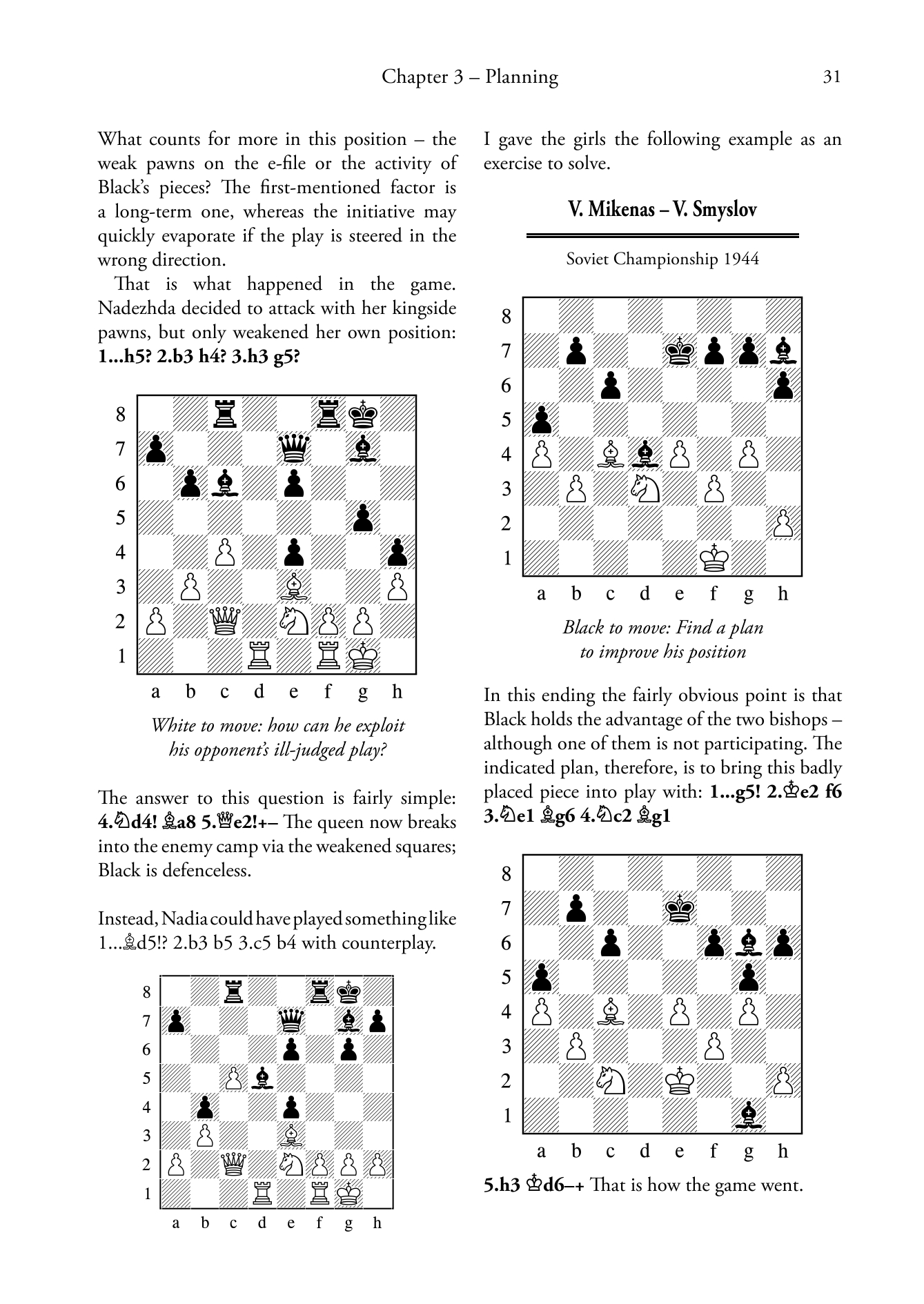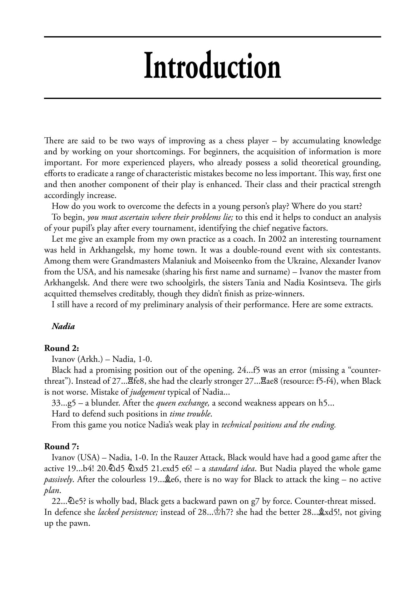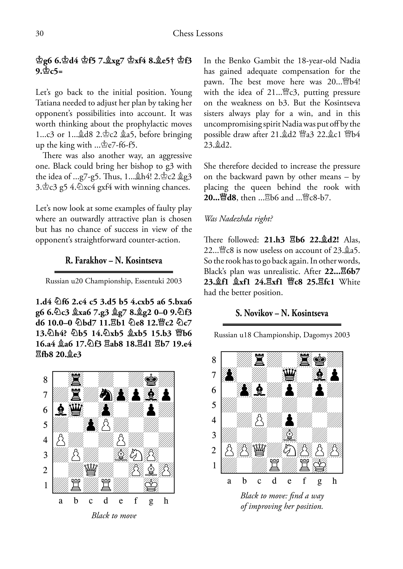 "In the Russian school of chess (the English school of chess is more difficult to define unless holding weekend tournaments in educational establishments counts) such accidents would be carefully eliminated with rigorous training programmes, and this technique is detailed in a book entitled Chess Lessons by Vladimir Popov. The author follows several of his pupils, the best-known of whom are the Kosintseva sisters, currently ranked numbers four and five on the female rating list, showing the training positions on which he has tested them and relevant fragments from their games. This kind of book can be rather heavy going, but this interplay has a certain charm and is cheering when his students make plenty of mistakes as well."