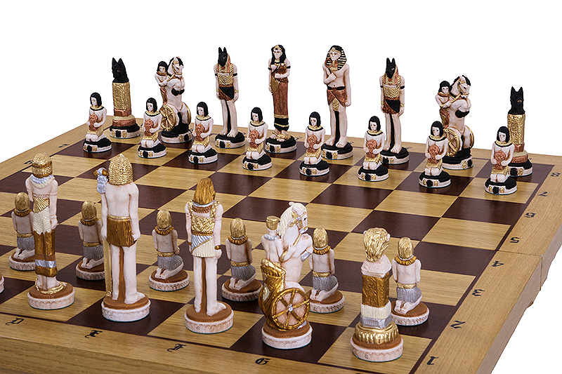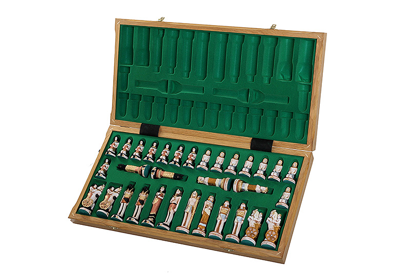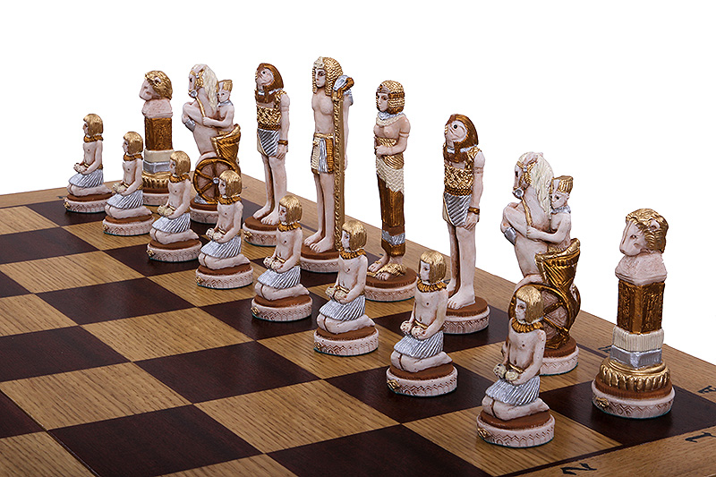 Zestaw EGIPT składa się z ręcznie malowanych, wykonanych z mączki marmurowej zlepionej żywicą, figur szachowych oraz składanej kasetki szachowej wykończonej intarsją z mahoniu i klonu.