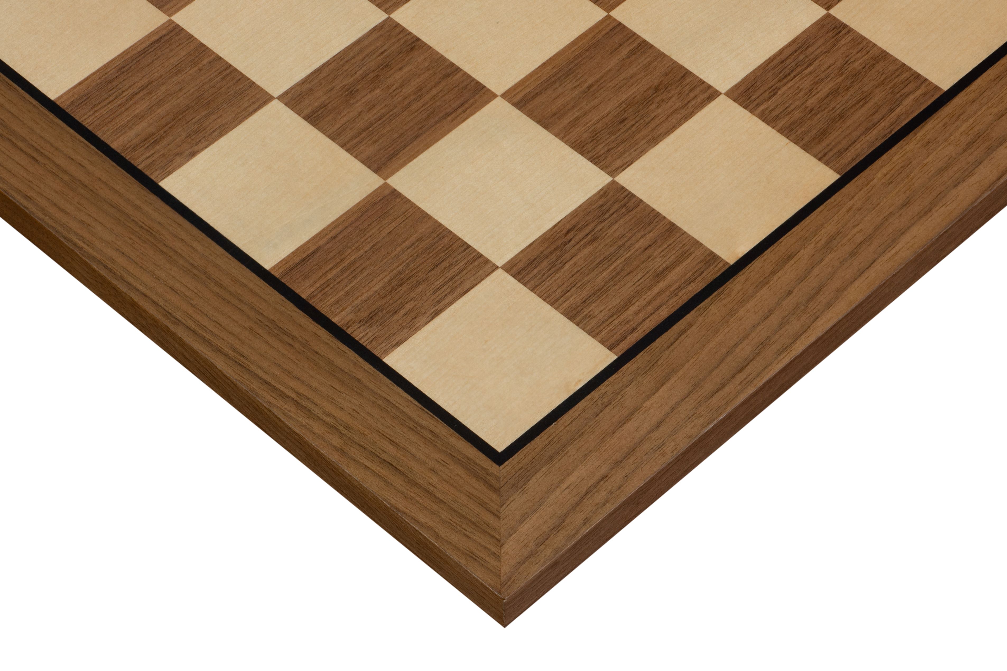 Przedmiotem oferty jest deska szachowa turniejowa o rozmiarach 54x54cm wykończona intarsją z orzecha i klonu. Szachownica posiada pola w rozmiarze 58 x 58 mm i idealnie nadaje się do naszych dużych figur w rozmiarze 3,75" - 4,25 " (król 9,5 - 11 cm).