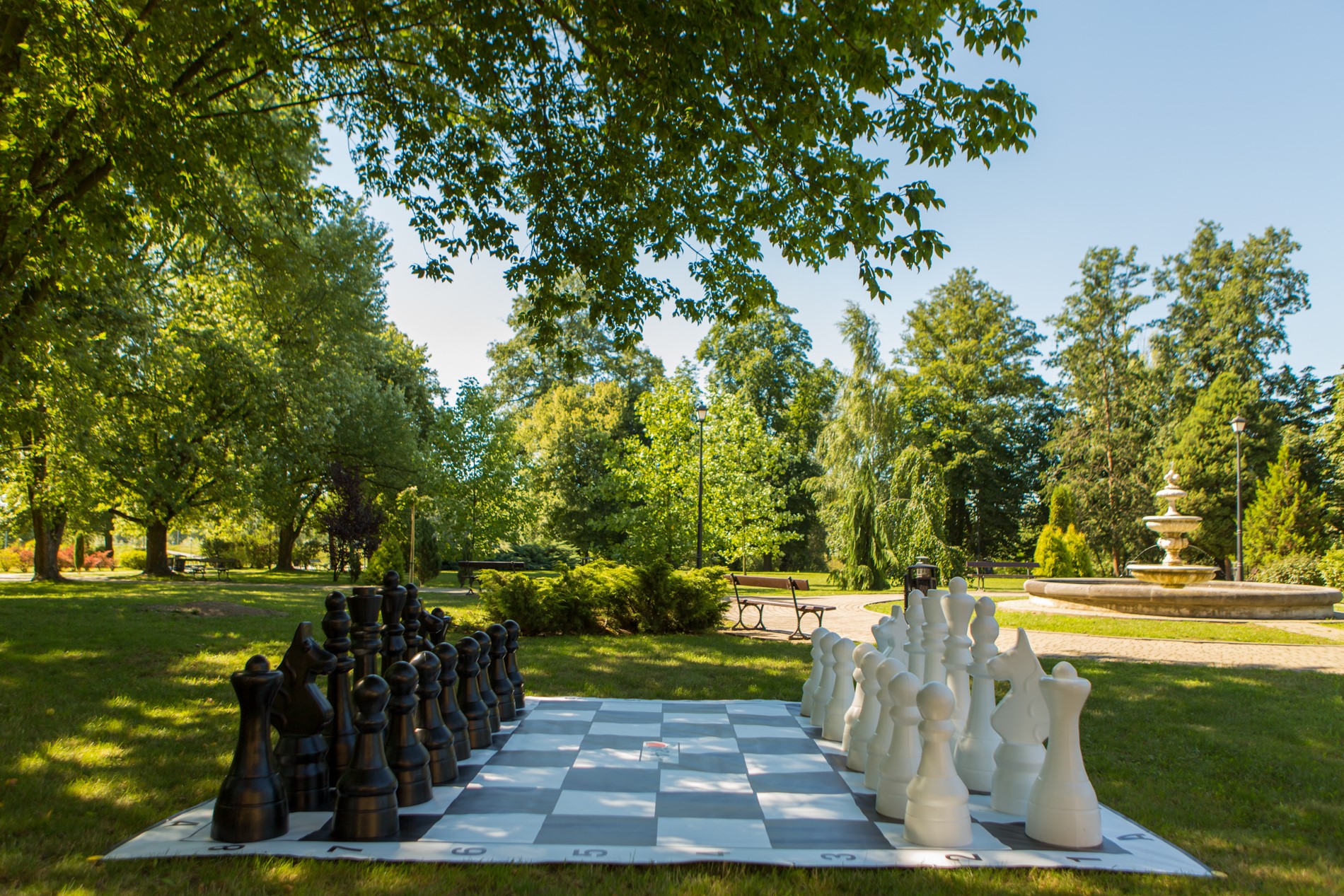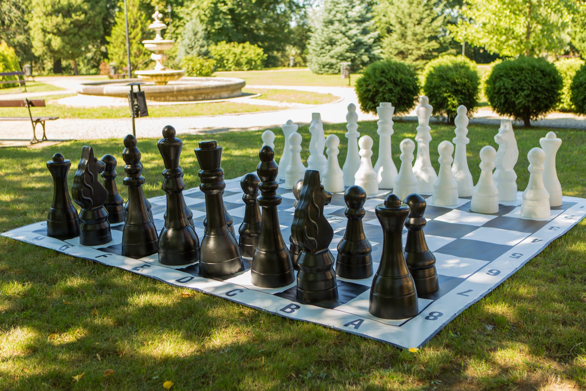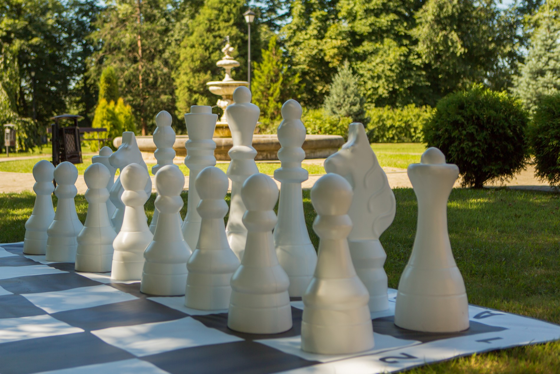 Polskie szachy plenerowe wykonane metodą formowania rotacyjnego z wysokiej jakości polietylenu. Dzięki specjalnej metodzie produkcji są one bardzo wytrzymałe na wszelkiego rodzaju uszkodzenia mechaniczne. Najwyższa figura (król) ma 1050 mm, najmniejsza (pion) 620 mm. Waga, wysokość i średnica podstawy poszczególnych bierek: