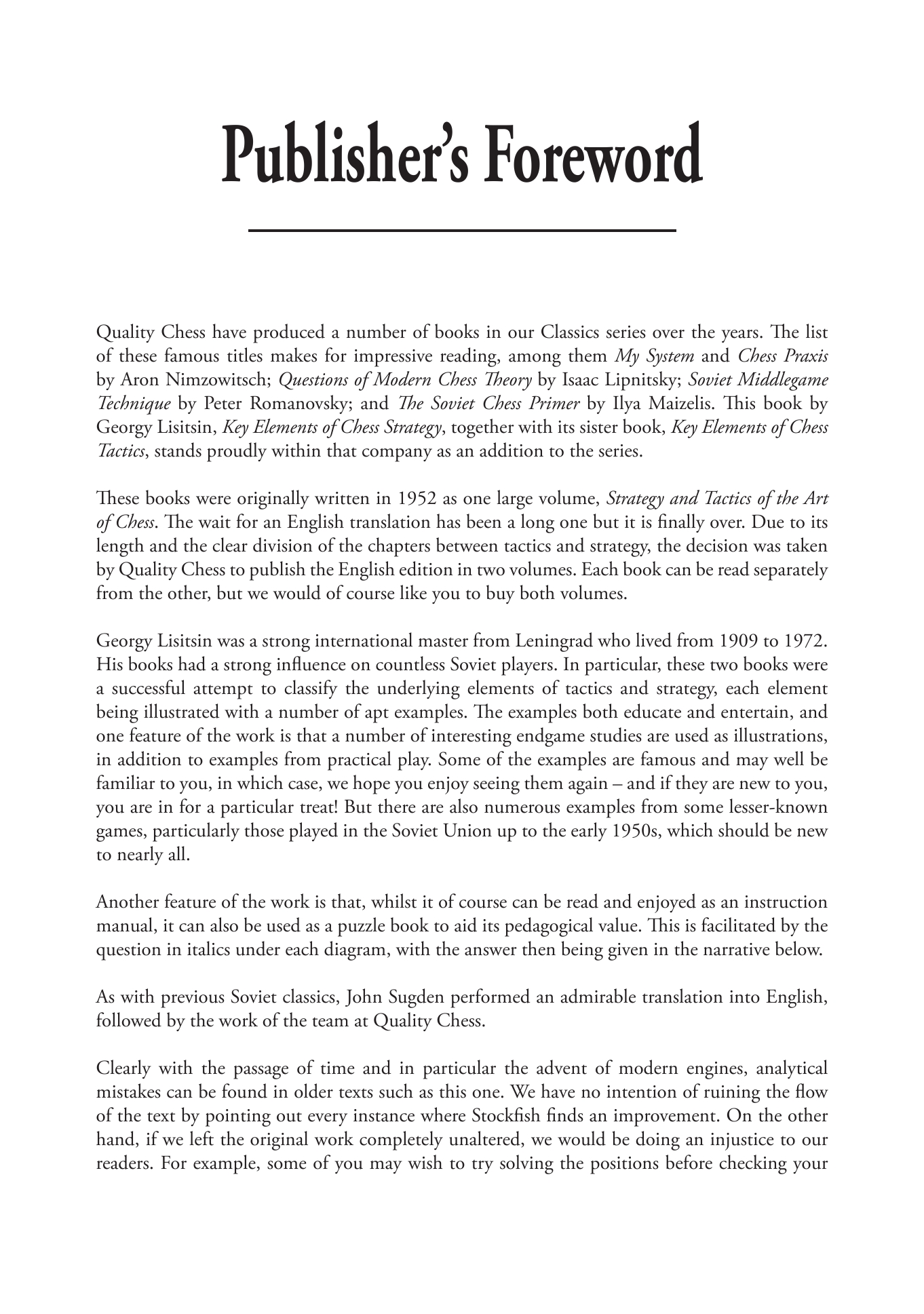 Lisitsin broke down Strategy and Tactics into their key constituent elements, enabling players of all levels to study chess systematically, learning from carefully selected game fragments and studies. Key Elements of Chess Strategy and its companion volume Key Elements of Chess Tactics are the first ever complete English translations of Lisitsin’s classic.