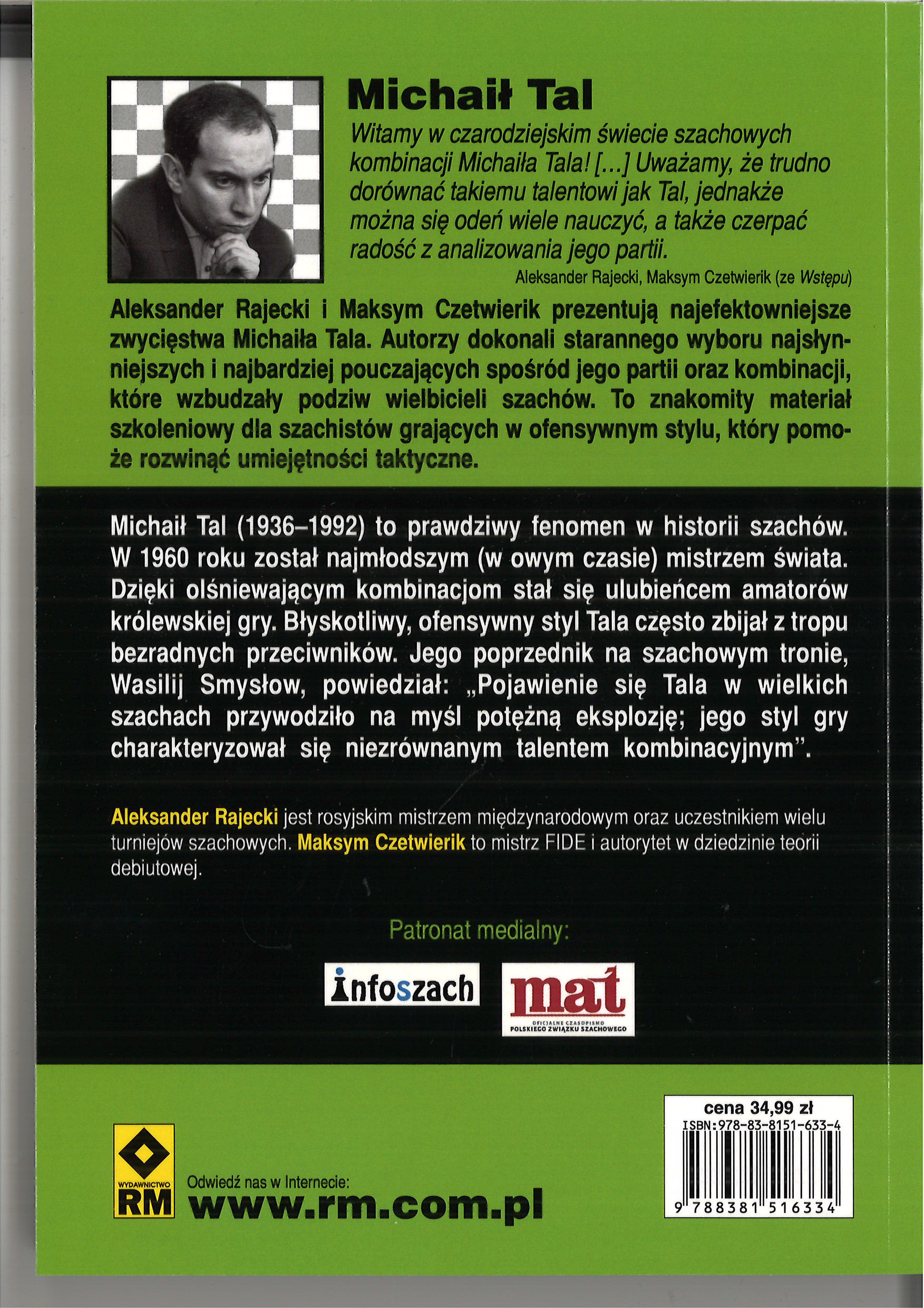 Książka zawiera: najefektowniejsze kombinacje Tala, znakomity materiał szkoleniowy dla szachistów grających w ofensywnym stylu, wiadomości pomagające rozwinąć umiejętności taktyczne czytelnika.