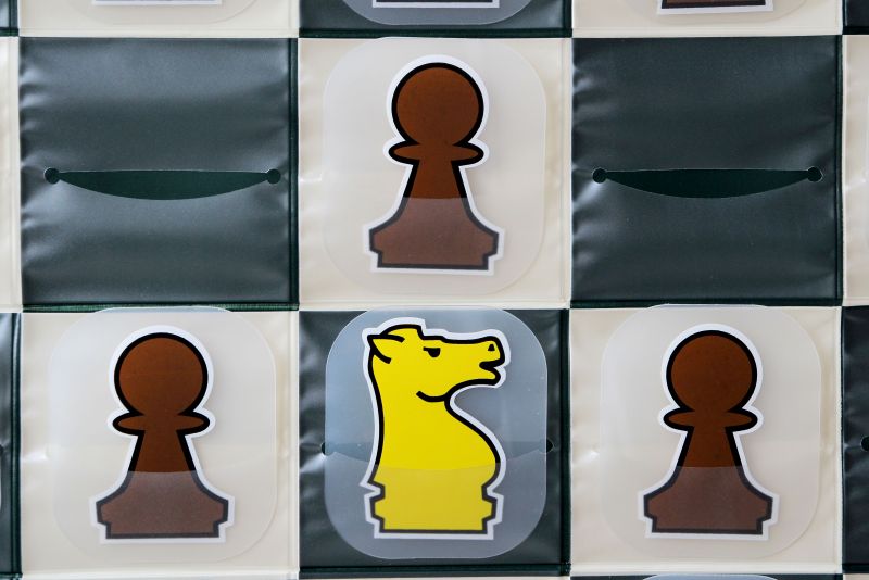 Szachownica jest zaopatrzona w przezroczyste kieszonki, w które wkłada się plastikowe karty, na których nadrukowane są symbole szachowe.
