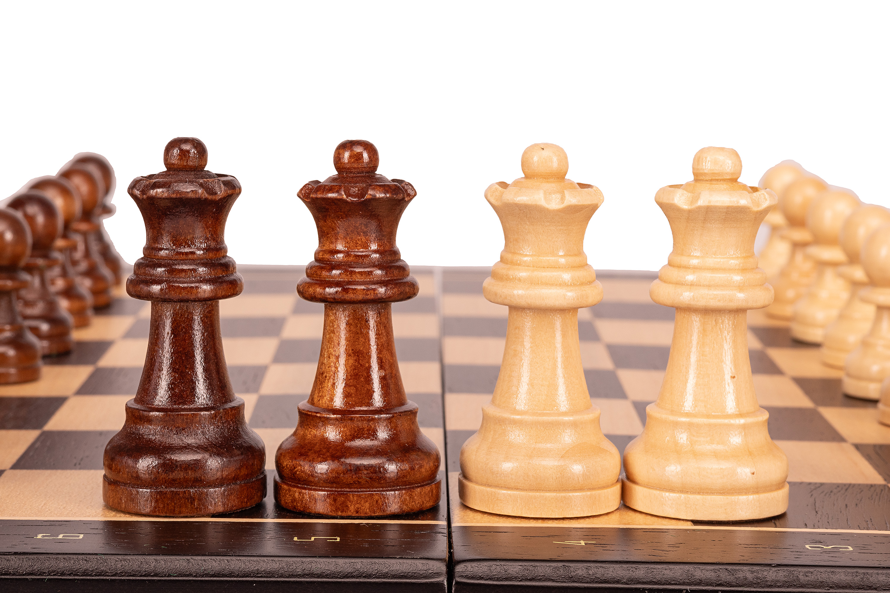W zestawie dodatkowe hetmany, umożliwiające prawidłową promocję piona