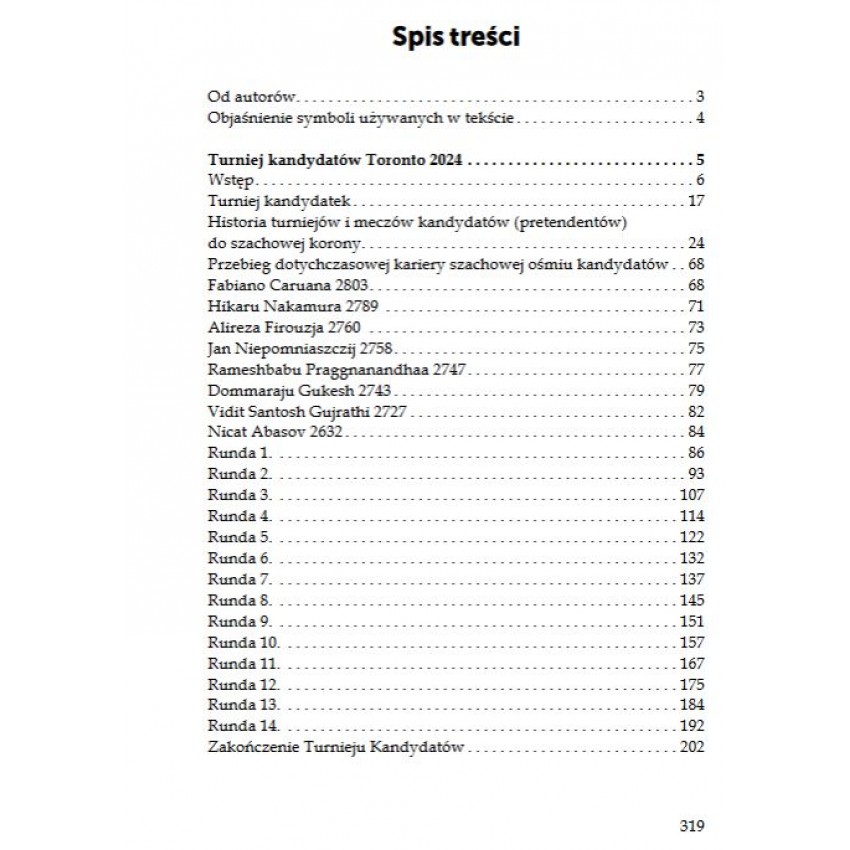 Pomysł napisania niniejszej książki dla polskiego Czytelnika zrodził się w głowach autorów kilka miesięcy wcześniej przed rozpoczęciem XIII turnieju kandydatów w Toronto i meczu o tytuł mistrza świata pomiędzy Ding Lirenem i Dommaraju Gukeshem w Singapurze. Należało jeszcze przekonać Wydawcę – co się zakończyło pozytywnym rozstrzygnięciem. W tym miejscu współautorzy dziękują panu Jerzemu Morasiowi, właścicielowi Wydawnictwa PENELOPA za ciepłe przyjęcie tej idei i wprowadzenie jej w czyn, czego owocem jest Turniej kandydatów Toronto 2024. Mecz Gukesh – Ding Singapur 2024. oraz panu Rafałowi Siwikowi za znakomite techniczne opracowanie książki wraz z fachowymi uwagami. Czas upływał nieubłaganie, zawody trwały i z każdym dniem zbliżały się do definitywnego zakończenia. Ogrom pracy i honorowe zobowiązanie, jakie wzięli na swoje barki autorzy były przytłaczające, ponieważ książka zawiera w sumie wszystkie siedemdziesiąt partii turnieju kandydatów i meczu o mistrzostwo świata, które są skomentowane ze szczególnym uwzględnieniem momentów krytycznych decydujących o losach poszczególnych pojedynków. W większości przypadków są one także uzupełnione o dodatkowe tematyczne przykłady z aktualnej praktyki turniejowej, aby w ten sposób wzbogacić i uposażyć Czytelnika w szeroki zakres wiedzy o granych otwarciach i wariantach. Oczywiście staraliśmy się także omawiać wszystkie fazy partii.