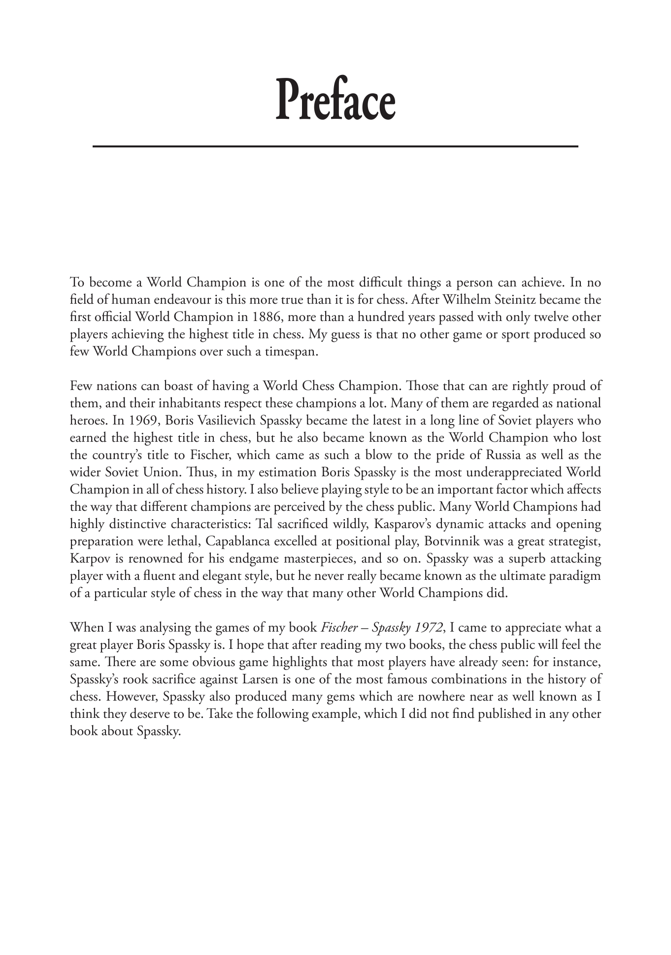 Born in 1937, Spassky barely escaped with his life when evacuating from the Siege of Leningrad as a young boy. This book tells the story of how that boy subsequently learned to play chess and rose through the Soviet ranks to become the strongest player in the world in the late 1960s.