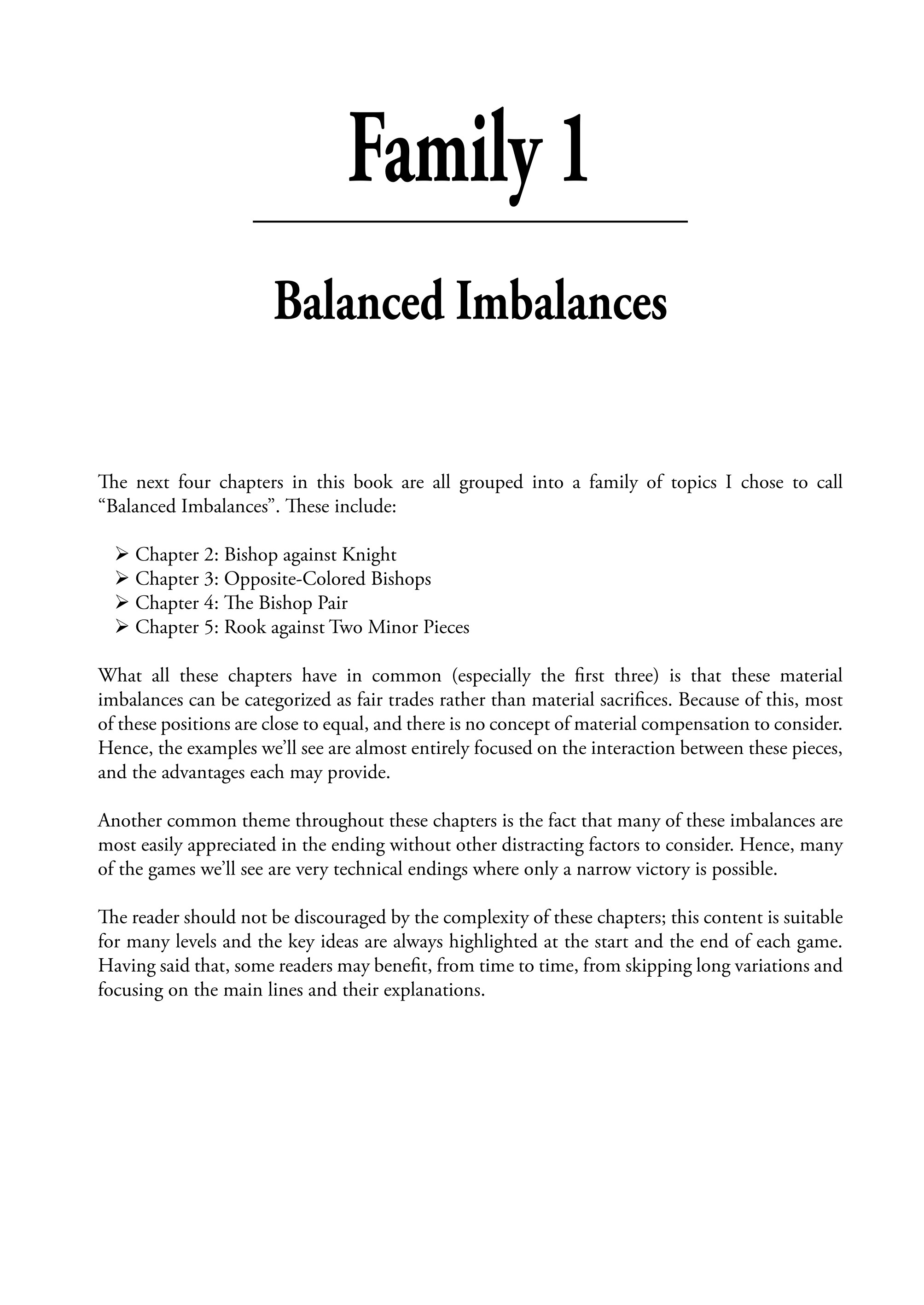 Material imbalances are a fundamental part of almost every chess game, yet have not received much attention in chess literature. In this illuminating book, GM Mauricio Flores Rios breaks down this universal topic into categories such as bishop vs knight, opposite-coloured bishops, possessing and playing against the bishop pair, and various scenarios with a queen or rook being traded for a number of pieces.