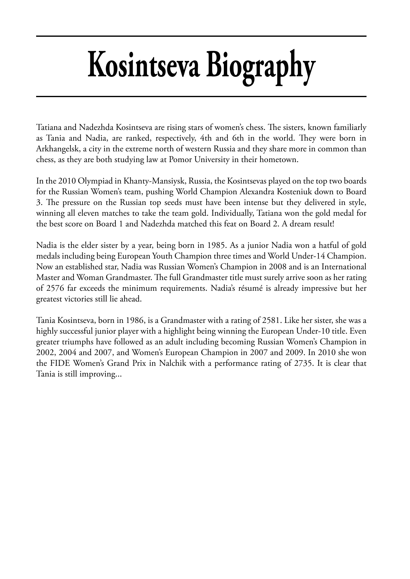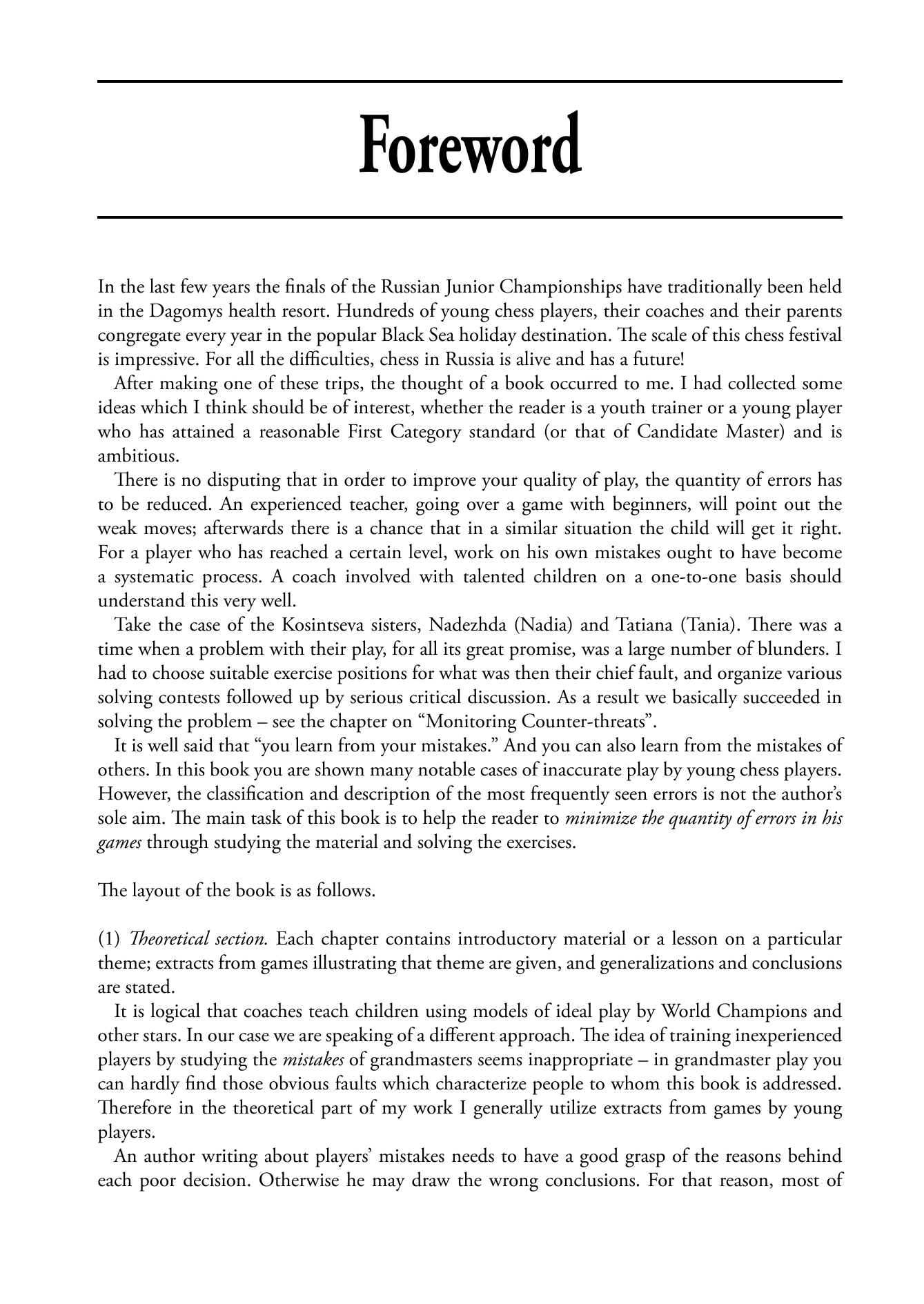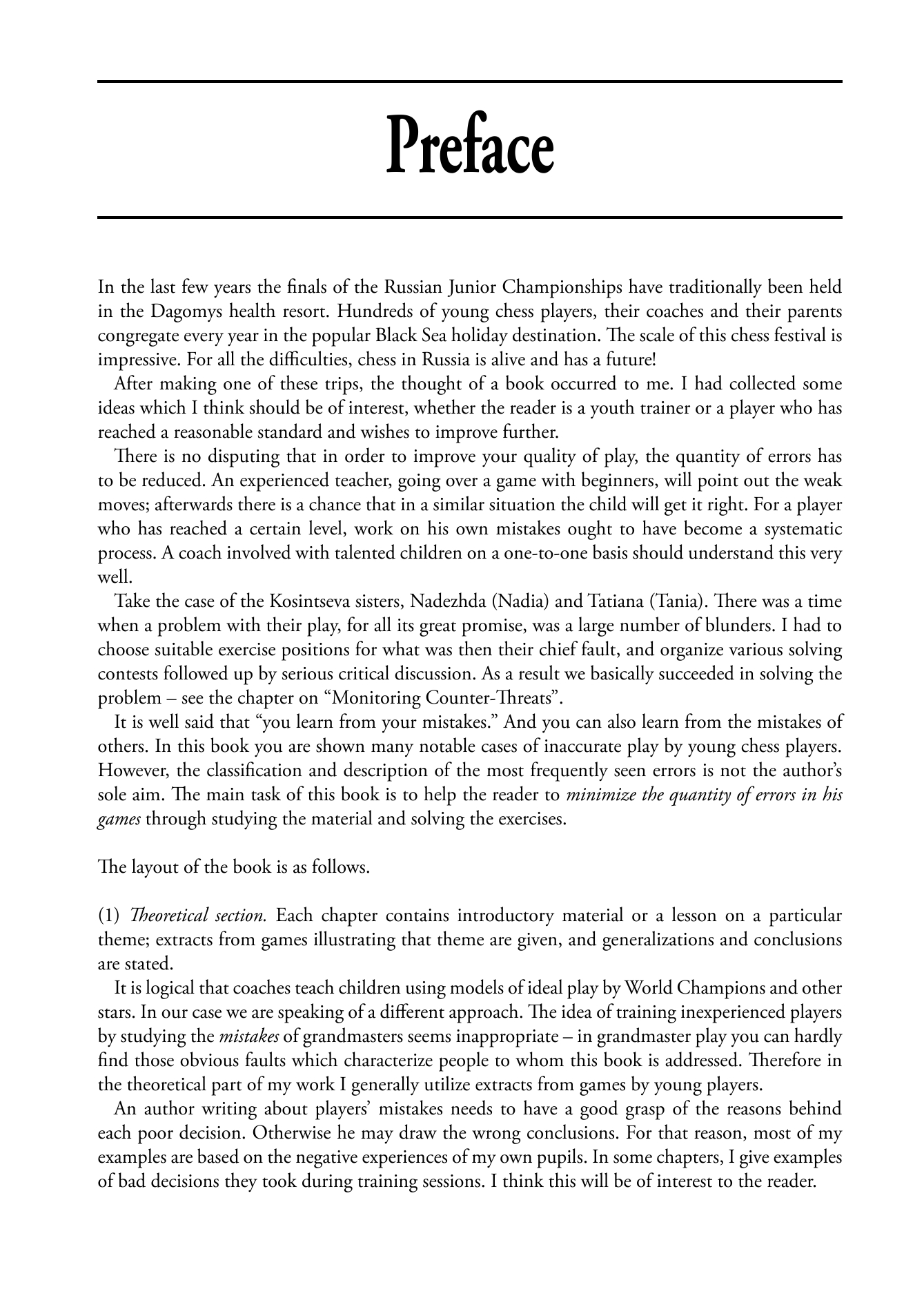 "In the Russian school of chess (the English school of chess is more difficult to define unless holding weekend tournaments in educational establishments counts) such accidents would be carefully eliminated with rigorous training programmes, and this technique is detailed in a book entitled Chess Lessons by Vladimir Popov. The author follows several of his pupils, the best-known of whom are the Kosintseva sisters, currently ranked numbers four and five on the female rating list, showing the training positions on which he has tested them and relevant fragments from their games. This kind of book can be rather heavy going, but this interplay has a certain charm and is cheering when his students make plenty of mistakes as well."