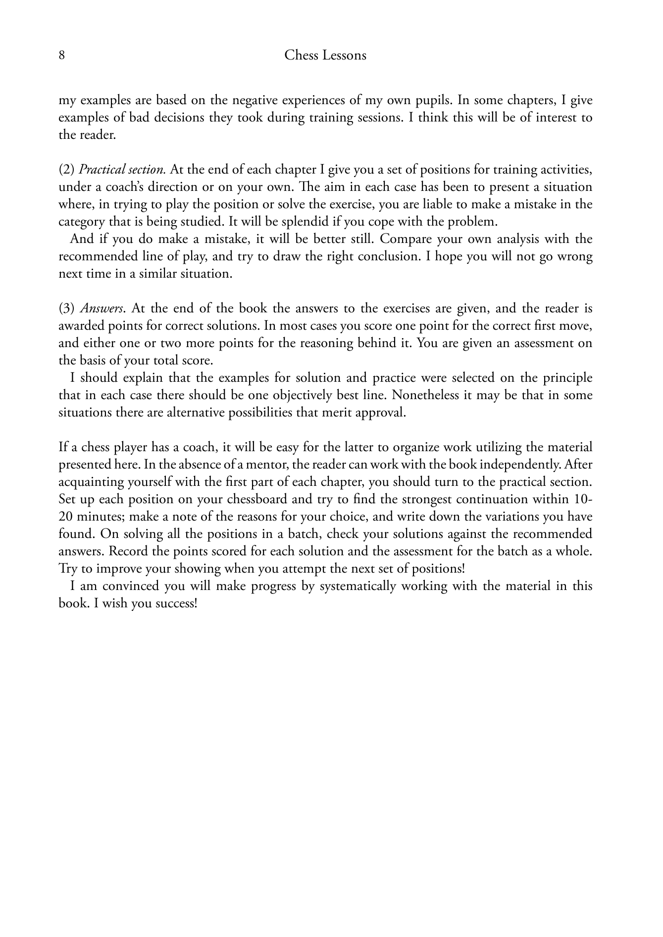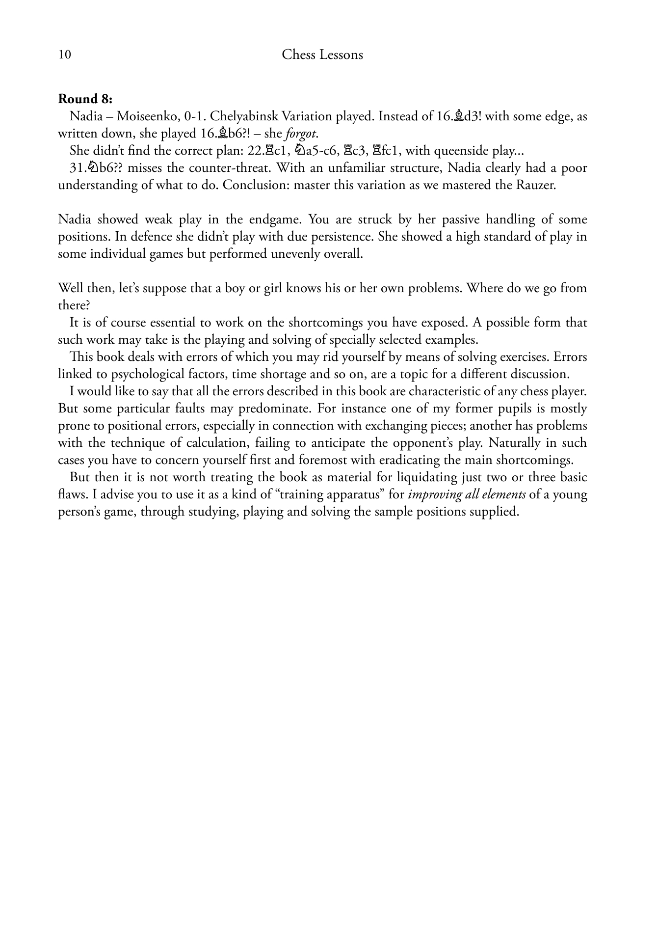 "The generic title Chess Lessons doesn't do justice to this book. Popov gave up playing in his twenties to devote his life to developing young talent and he has given a lot of thought how best do this... Chess Lessons is an excellent book that will prove helpful for not only the examples it offers but the ways it teaches one how to look at the game. Highly recommended for players from 1800 on up."