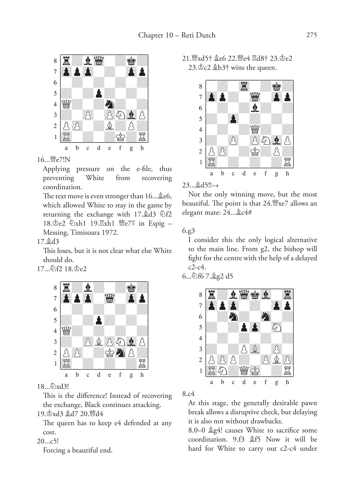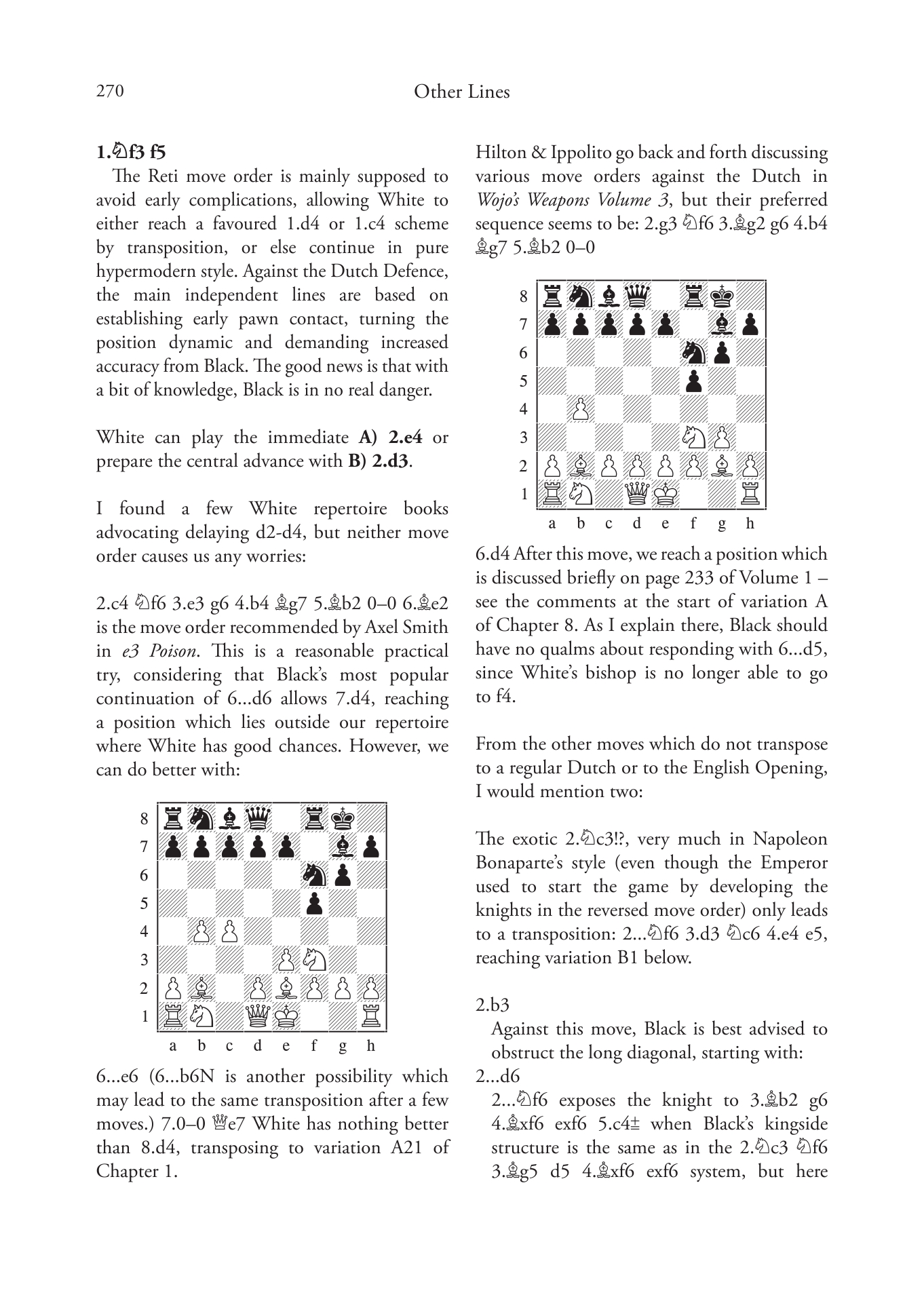 Dutch Sidelines covers lines where White does not fianchetto his king’s bishop. These include 1.d4 f5 2.c4 lines, as well as Anti-Dutch options such as 2.Bg5, 2.Nc3 and various gambits. In addition, the author offers extensive guidance on how to meet 1.Nf3 and 1.c4 in Dutch style. The companion volume, Leningrad Dutch, is the cornerstone of Black’s Dutch repertoire.