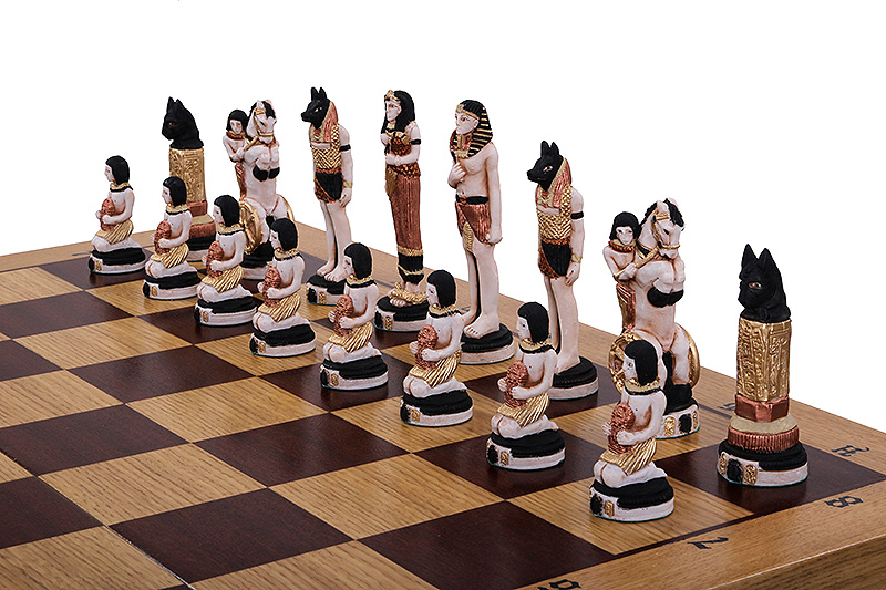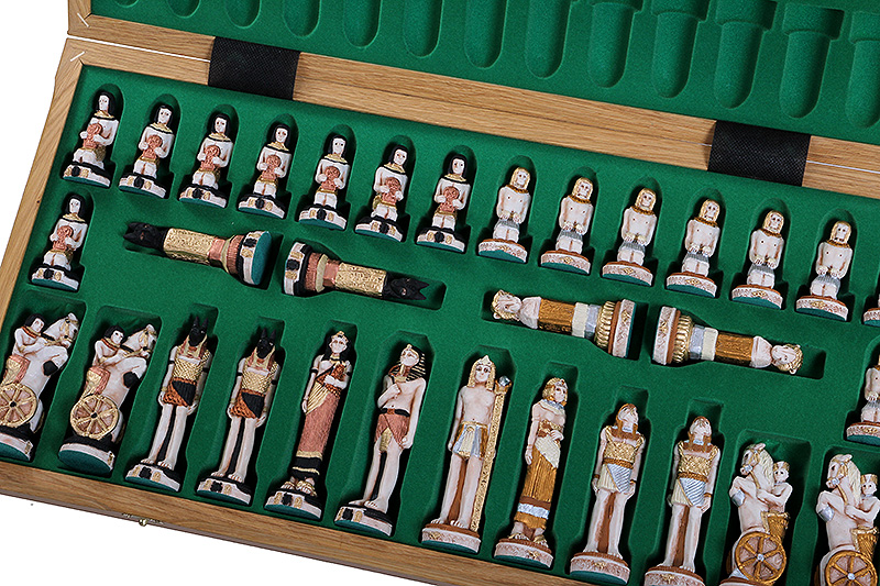 Zestaw EGIPT składa się z ręcznie malowanych, wykonanych z mączki marmurowej zlepionej żywicą, figur szachowych oraz składanej kasetki szachowej wykończonej intarsją z mahoniu i klonu.