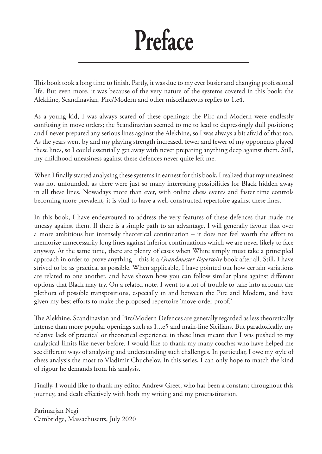 The fifth volume of the Grandmaster Repertoire – 1.e4 series provides a top-class repertoire against the Alekhine, Scandinavian, Pirc and Modern Defences, plus various offbeat alternatives Black may try. Negi’s latest work continues the winning formula of his previous books: the 1.e4 repertoire is founded on established main lines and turbo-charged with the innovative ideas of a world-class theoretician, making this an essential addition to the library of every ambitious player.