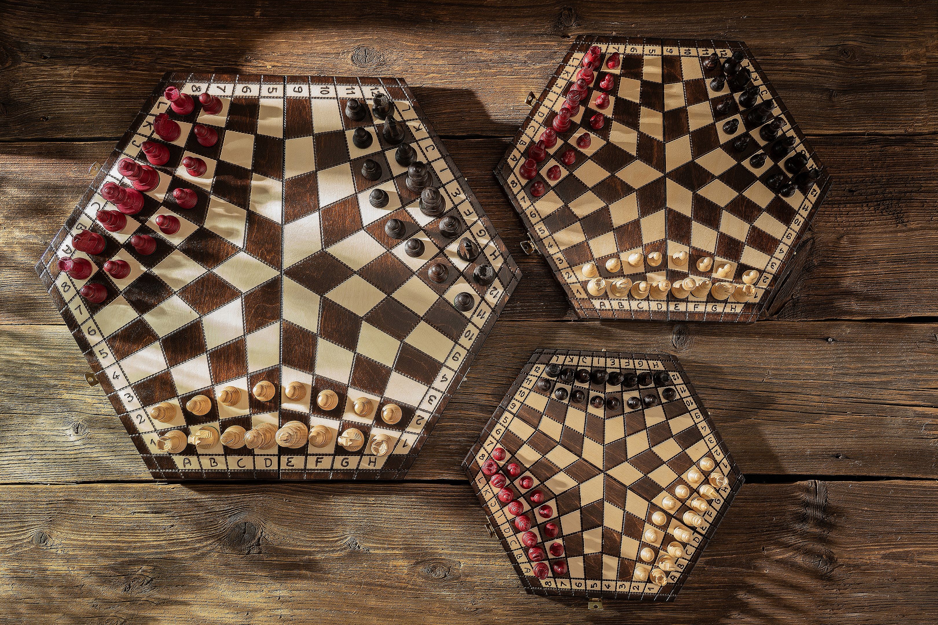Szachy dla trójki graczy to unikalna wersja szachów składająca się ze specjalnej sześciokątnej szachownicy i trzech różnokolorowych zestawów figur, pozwalająca na rozegranie partii przez 3 osoby równocześnie.