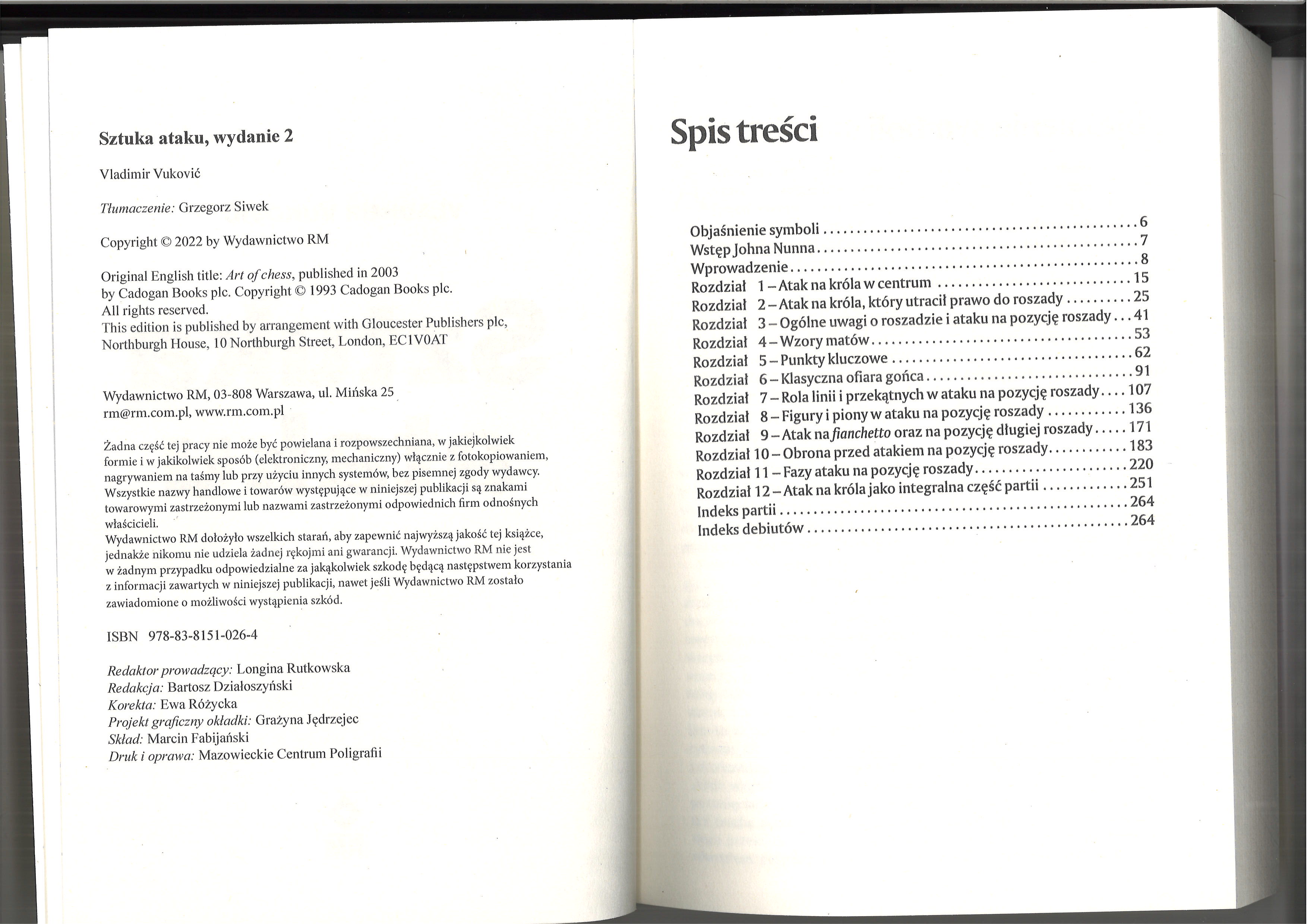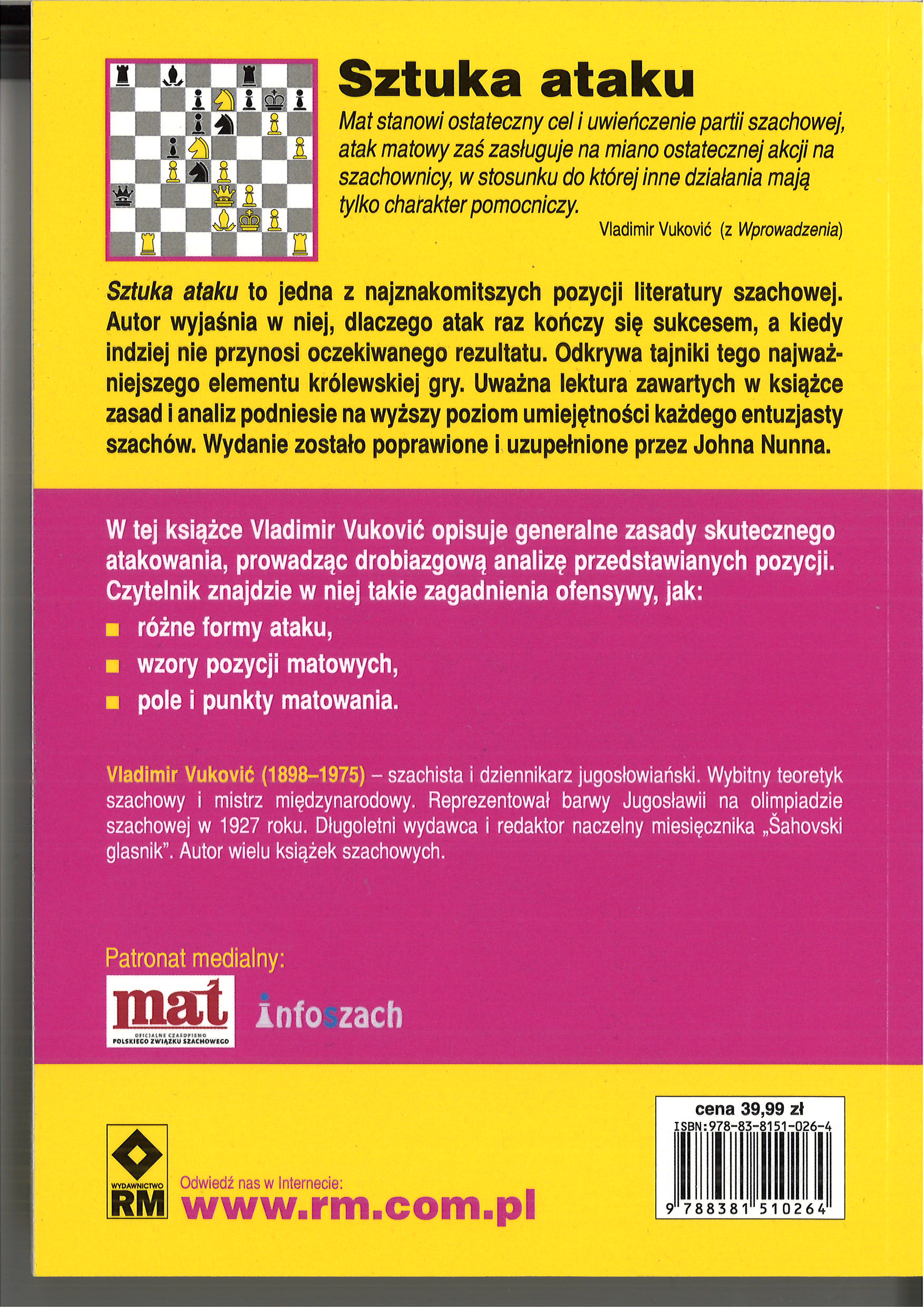 Prezentujemy "Sztukę ataku", jedną z najznakomitszych pozycji literatury szachowej, która po raz pierwszy trafia do rąk czytelnika w nowej edycji, z zastosowaniem notacji algebraicznej. W obecnym, poprawionym i uzupełnionym wydaniu tej klasycznej książki autor, jugosłowiański mistrz międzynarodowy Vladimir Vuković, odkrywa tajniki - również te najbardziej złożone - dziedziny kunsztu szachowego, jaką stanowią różnorodne formy i rodzaje ataku na króla. Uważna lektura owego arcydzieła podniesie na wyższy poziom umiejętności każdego entuzjasty szachów.