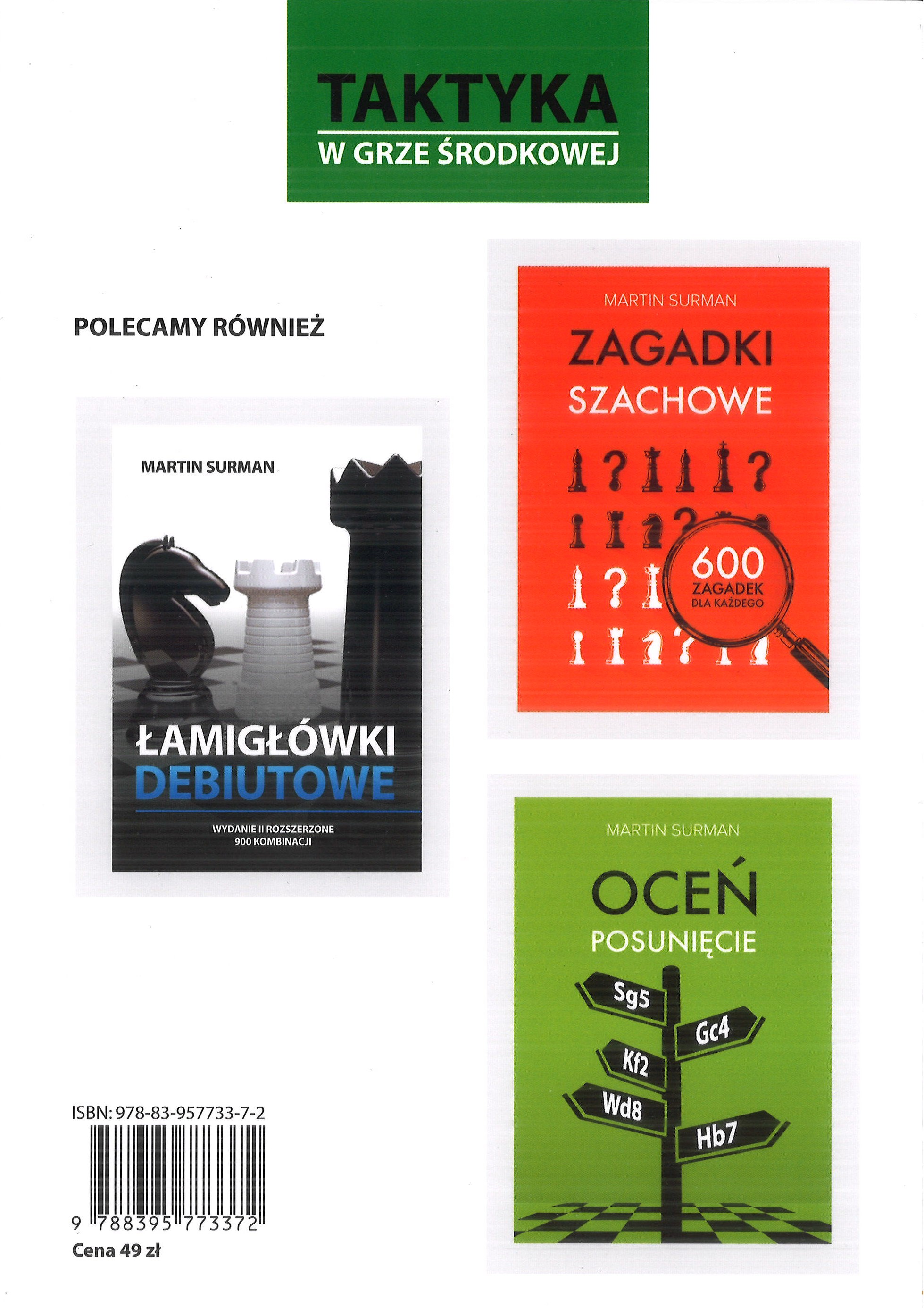 Taktyka w grze środkowej to książka, która zawiera 1500 świetnych zadań szachowych pogrupowanych na 15 tematów oraz na 4 poziomy trudności. Sprawia to, że jest uniwersalna i każdy znajdzie coś dla siebie. Wszystkie kombinacje są tak dobrane, aby możliwe było tylko jedno prawidłowe rozwiązanie, prowadzące do wygranej.